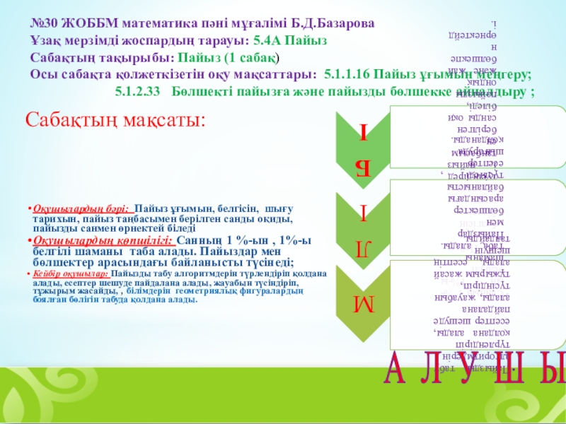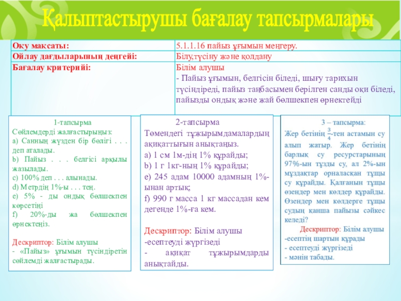 Осы сабақта қолжеткізетін оқу мақсаттары: 5.1.1.16 Пайыз ұғымын меңгеру;