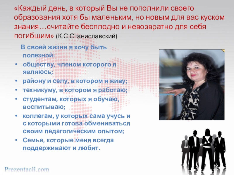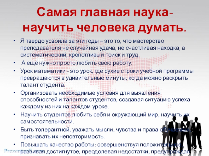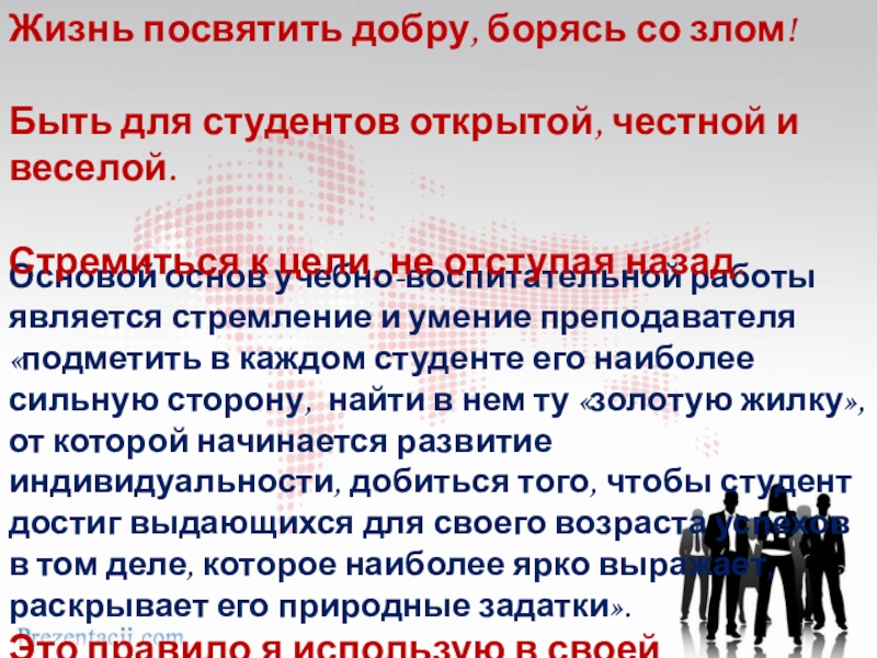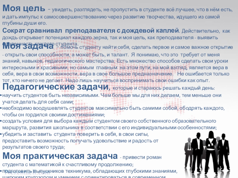Моя задача - помочь студенту найти себя, сделать первое и самое важное открытие - открыть свои способности, а может быть, и талант. Я понимаю, что это требует от меня знаний, навыков, педагогического мастерства. Есть множество способов сделать свои уроки интересными и красивыми, но самым главным на этом пути, на мой взгляд, является вера в себя, вера в свои возможности, вера в свое большое предназначение. Не ошибается только тот, кто ничего не делает. Надо лишь научиться воспринимать свои ошибки как опыт.