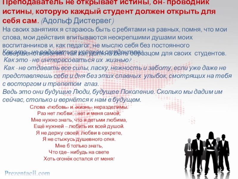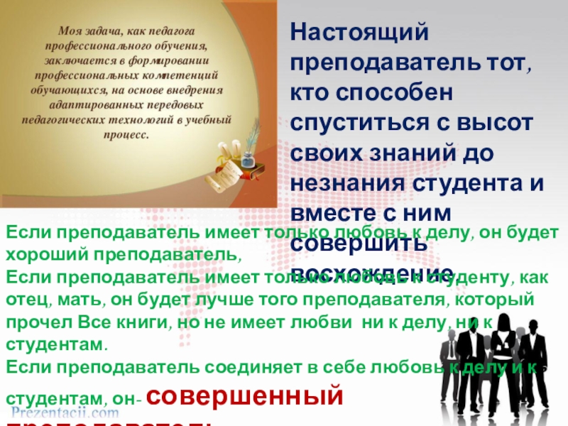 Сократ сравнивал преподавателя с дождевой каплей. Действительно, как дождь открывает потенциал каждого зерна, так и моя цель, как преподавателя - выявить одаренность каждого студента.