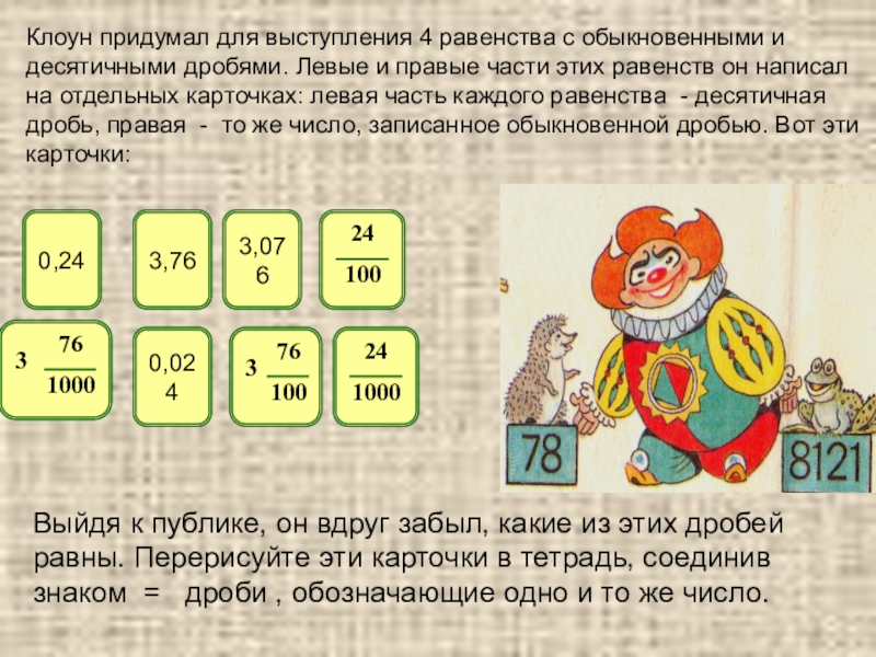 Выйдя к публике, он вдруг забыл, какие из этих дробей равны. Перерисуйте эти карточки в тетрадь, соединив знаком = дроби , обозначающие одно и то же число.