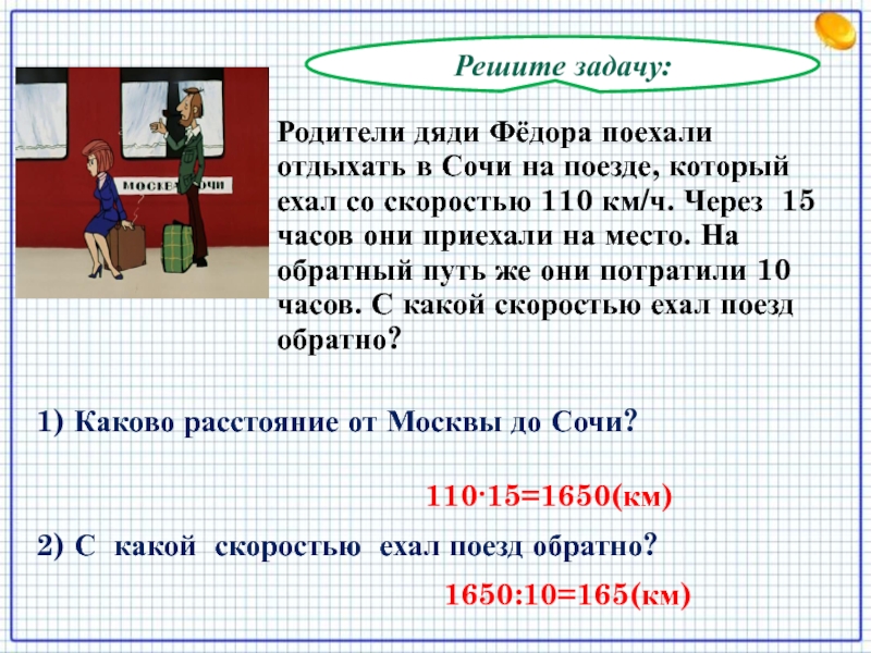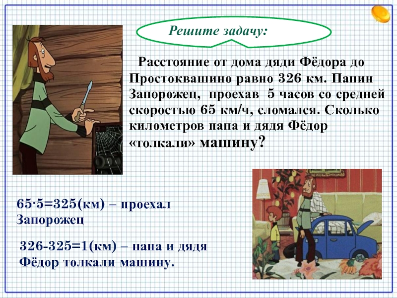 326-325=1(км) – папа и дядя Фёдор толкали машину.