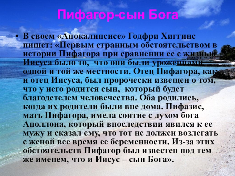 истории Пифагора при сравнении ее с жизнью Иисуса было то, что они были уроженцами одной и той же местности. Отец Пифагора, как и отец Иисуса, был пророчески извещен о том, что у него родится сын, который будет благодетелем человечества. Оба родились, когда их родители были вне дома. Пифазис, мать Пифагора, имела соитие с духом бога Аполлона, который впоследствии явился к ее мужу и сказал ему, что тот не должен возлегать с женой все время ее беременности. Из-за этих обстоятельств Пифагор был известен под тем же именем, что и Иисус – сын Бога».