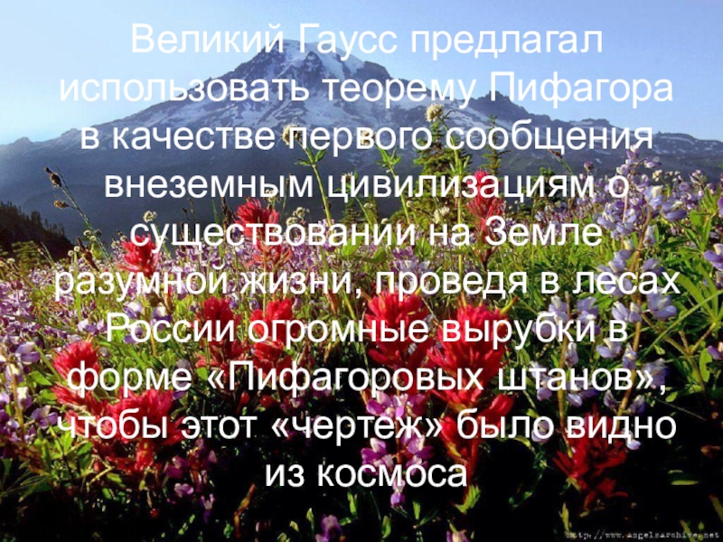 Слайд 15Великий Гаусс предлагал использовать теорему Пифагора в качестве первого сообщения внеземным