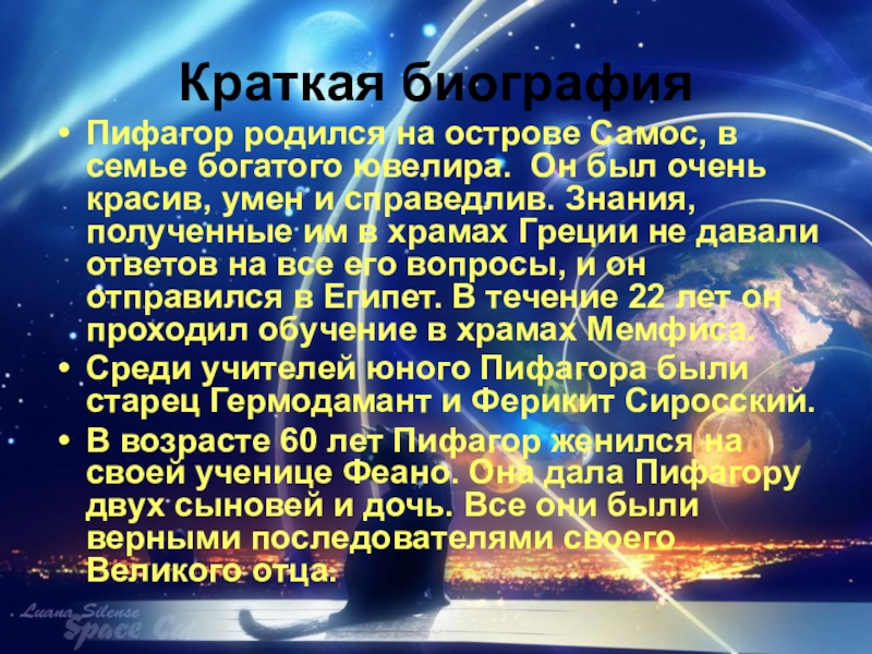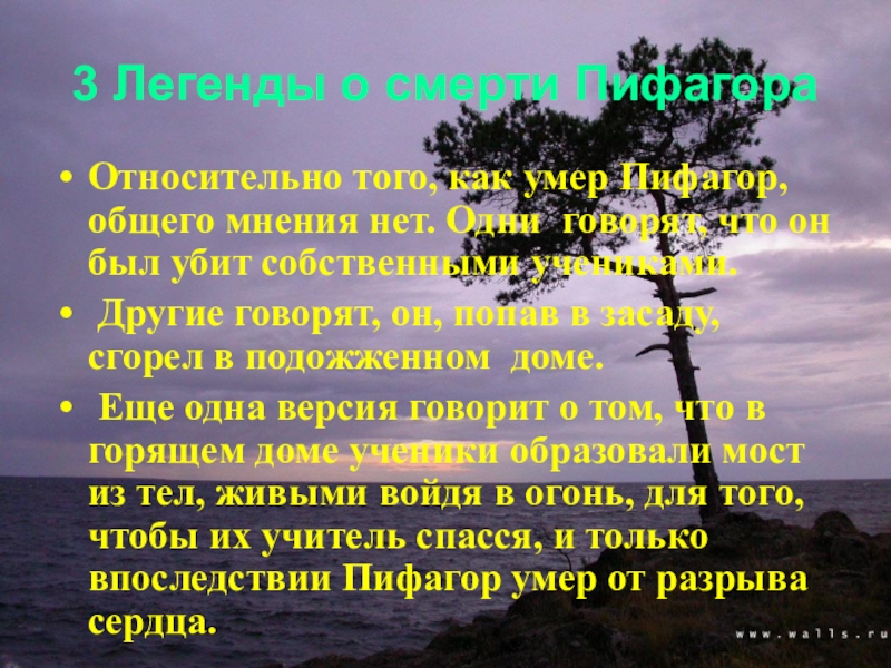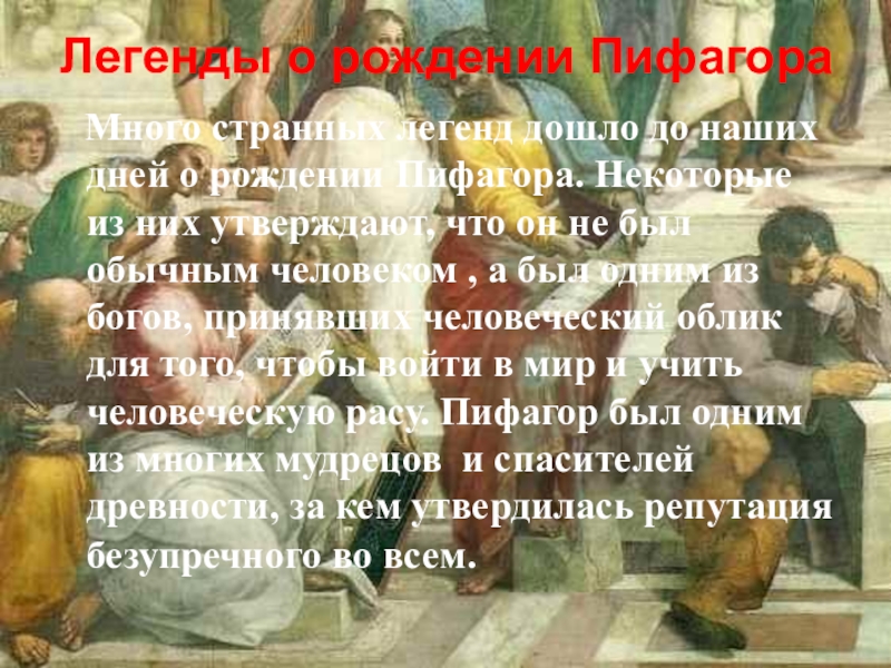 дней о рождении Пифагора. Некоторые из них утверждают, что он не был обычным человеком , а был одним из богов, принявших человеческий облик для того, чтобы войти в мир и учить человеческую расу. Пифагор был одним из многих мудрецов и спасителей древности, за кем утвердилась репутация безупречного во всем.