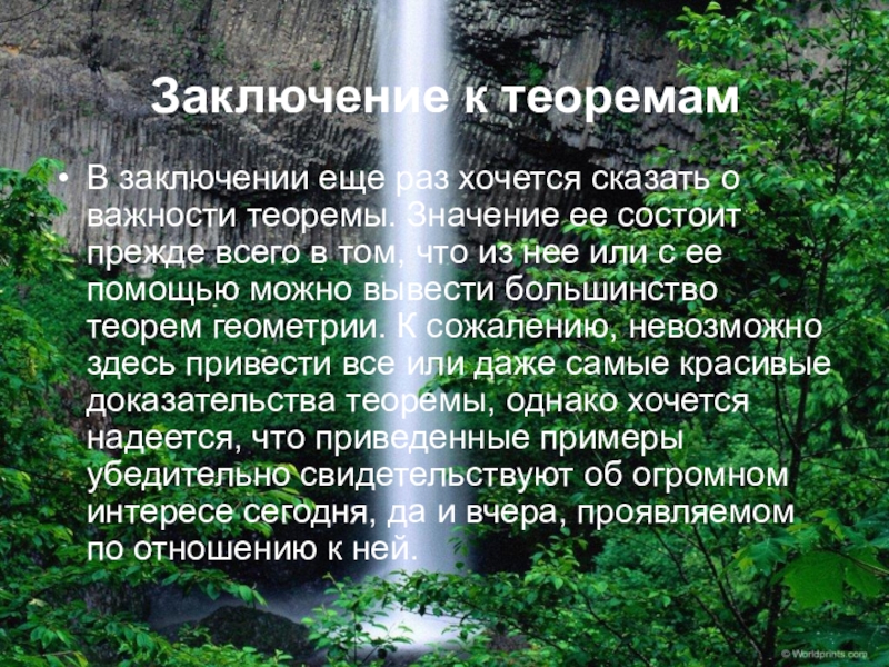 Значение ее состоит прежде всего в том, что из нее или с ее помощью можно вывести большинство теорем геометрии. К сожалению, невозможно здесь привести все или даже самые красивые доказательства теоремы, однако хочется надеется, что приведенные примеры убедительно свидетельствуют об огромном интересе сегодня, да и вчера, проявляемом по отношению к ней.