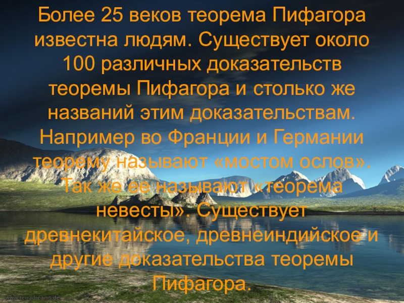 Слайд 8Более 25 веков теорема Пифагора известна людям. Существует около 100 различных