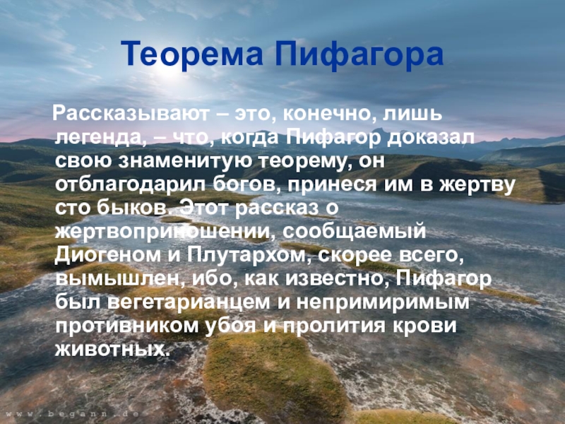 когда Пифагор доказал свою знаменитую теорему, он отблагодарил богов, принеся им в жертву сто быков. Этот рассказ о жертвоприношении, сообщаемый Диогеном и Плутархом, скорее всего, вымышлен, ибо, как известно, Пифагор был вегетарианцем и непримиримым противником убоя и пролития крови животных.