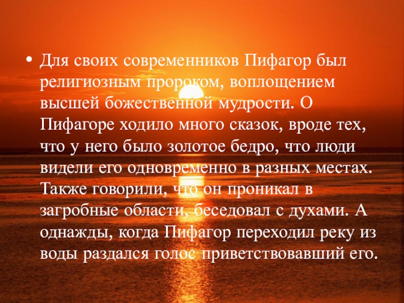 О Пифагоре ходило много сказок, вроде тех, что у него было золотое бедро, что люди видели его одновременно в разных местах. Также говорили, что он проникал в загробные области, беседовал с духами. А однажды, когда Пифагор переходил реку из воды раздался голос приветствовавший его.