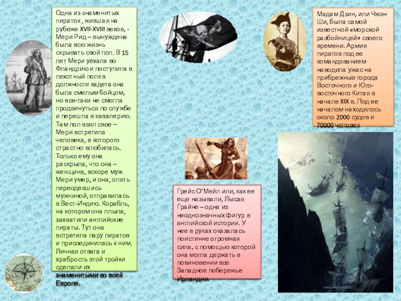 Одна из знаменитых пираток , жившая на рубеже XVII-XVIII веков, - Мери Рид – вынуждена была всю жизнь скрывать свой пол. В 15 лет Мери уехала во Фландрию и поступила в пехотный полк в должности кадета она была смелым бойцом, но все-таки не смогла продвинуться по службе и перешла в кавалерию. Там пол взял свое – Мери встретила человека, в которого страстно влюбилась. Только ему она раскрыла, что она – женщина, вскоре муж Мери умер, и она, опять переодевшись мужчиной, отправилась в Вест-Индию. Корабль, на котором она плыла, захватили английские пираты. Тут она встретила пару пиратов и присоединилась к ним. Личная отвага и храбрость этой тройки сделали их знаменитыми во всей Европе.