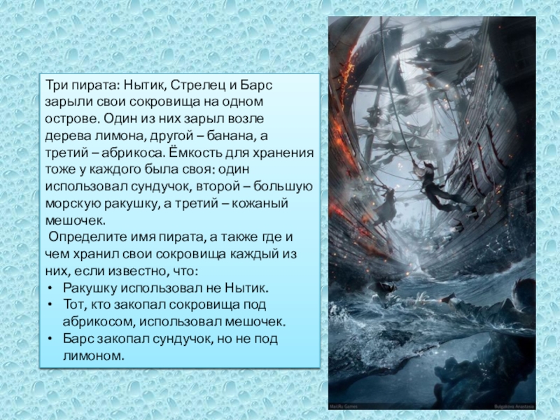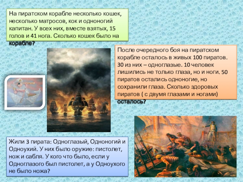 Жили 3 пирата: Одноглазый, Одноногий и Одноухий. У них было оружие: пистолет, нож и сабля. У кого что было, если у Одноглазого был пистолет, а у Одноухого не было ножа?