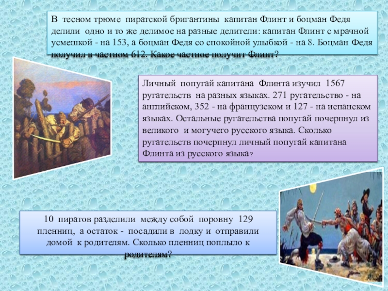 10 пиратов разделили между собой поровну 129 пленниц, а остаток - посадили в лодку и отправили домой к родителям. Сколько пленниц поплыло к родителям?