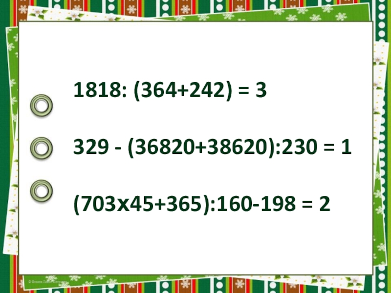 1818: (364+242) = 3329 - (36820+38620):230 = 1(703х45+365):160-198 = 2