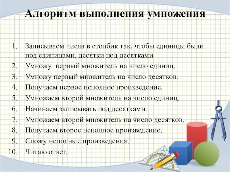 Алгоритм выполнения умножения Записываем числа в столбик так, чтобы единицы были под единицами, десятки под десяткамиУмножу первый