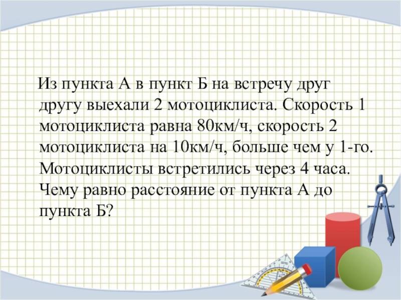 другу выехали 2 мотоциклиста. Скорость 1 мотоциклиста равна 80км/ч, скорость 2 мотоциклиста на 10км/ч, больше чем у 1-го. Мотоциклисты встретились через 4 часа. Чему равно расстояние от пункта А до пункта Б?