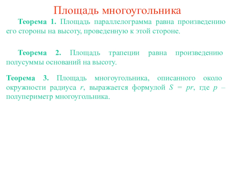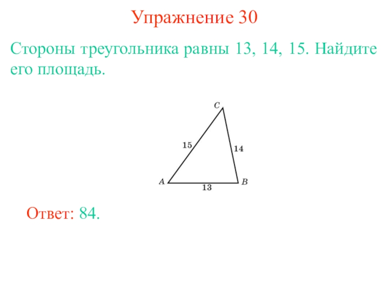 Теорема 3. Площадь треугольника выражается формулой (формула Герона): где a, b, c – стороны треугольника, p – его полупериметр.