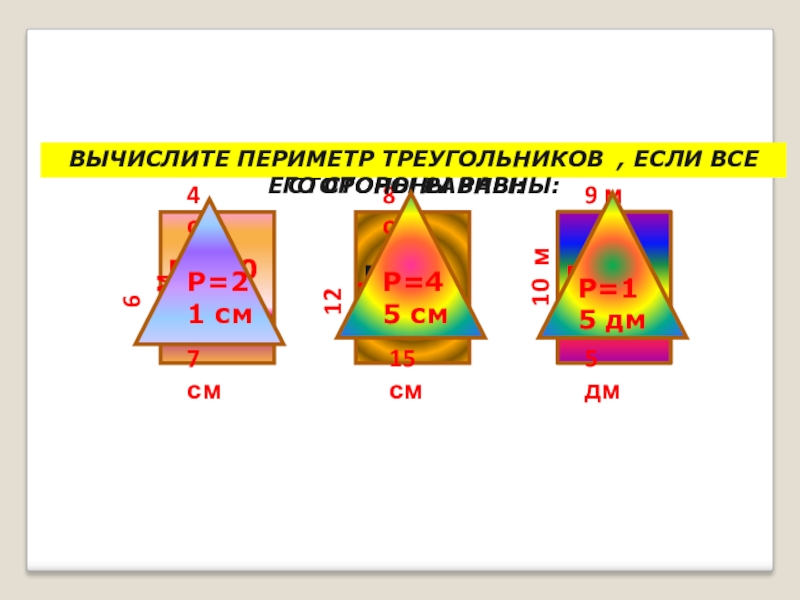 ВЫЧИСЛИТЕ ПЕРИМЕТР ТРЕУГОЛЬНИКОВ , ЕСЛИ ВСЕ ЕГО СТОРОНЫ РАВНЫ: