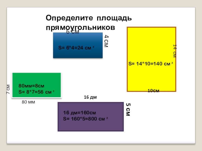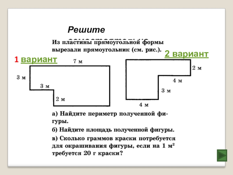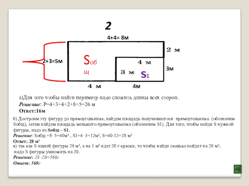 Решение: Sобщ =8∙ 5=40м² , S1=4∙ 3=12м², S=40-12=28 м²