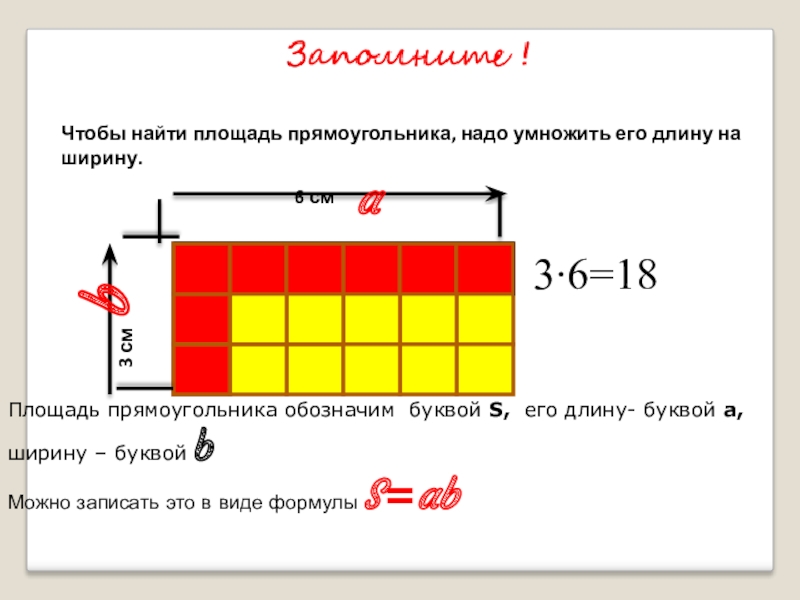 Площадь прямоугольника обозначим буквой S, его длину- буквой а, ширину – буквой b