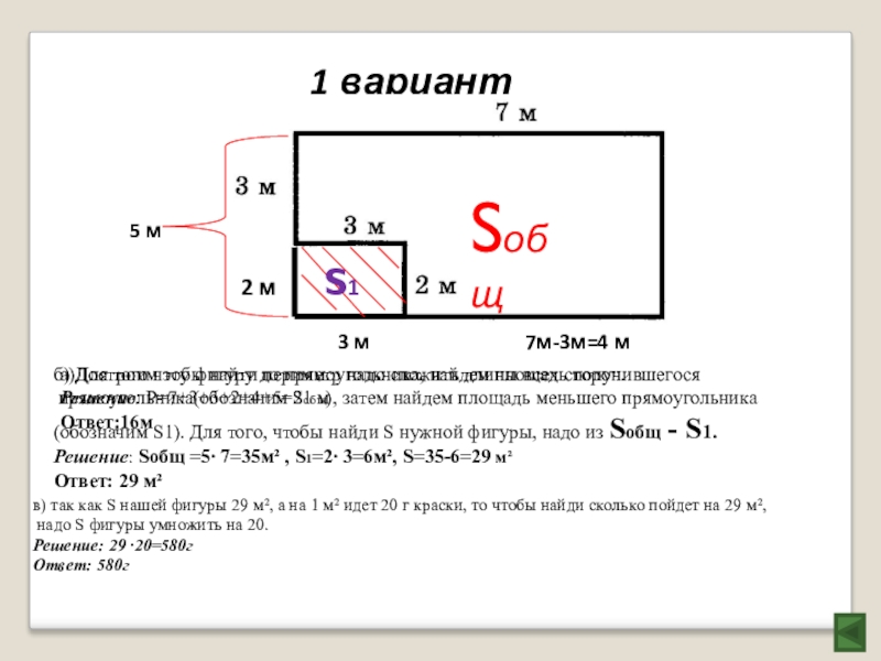 Решение: Sобщ =5∙ 7=35м² , S1=2∙ 3=6м², S=35-6=29 м²