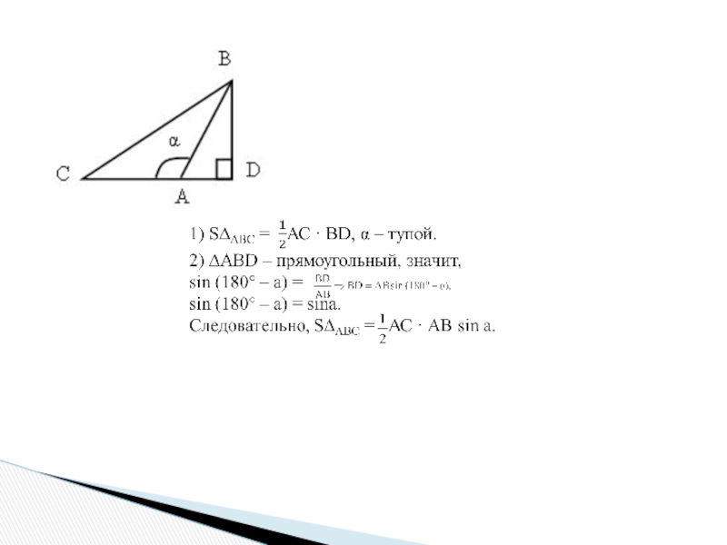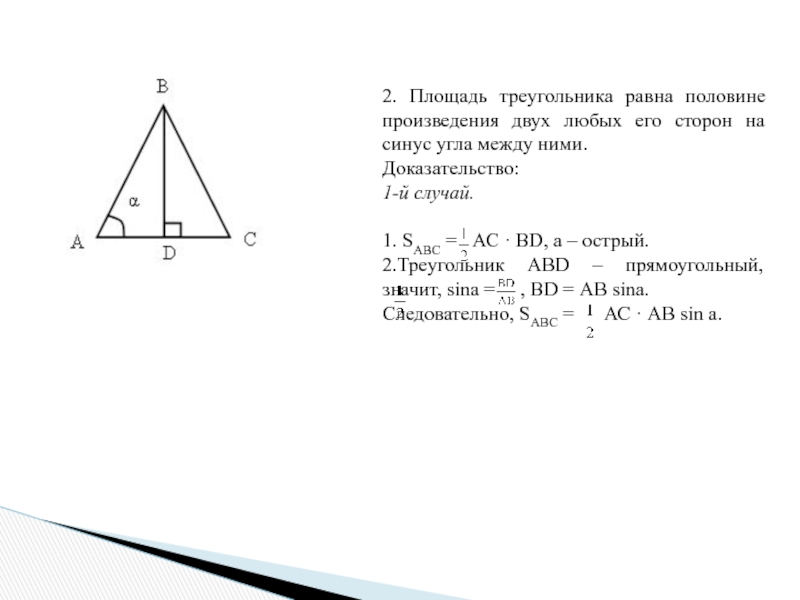 2. Площадь треугольника равна половине произведения двух любых его сторон на синус угла между ними.Доказательство:1-й случай.1. SАВС