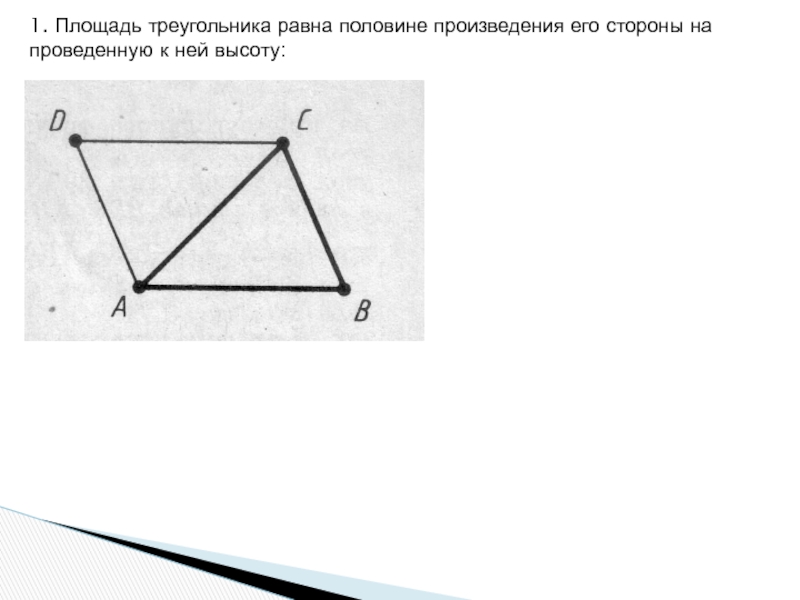 1. Площадь треугольника равна половине произведения его стороны на проведенную к ней высоту: