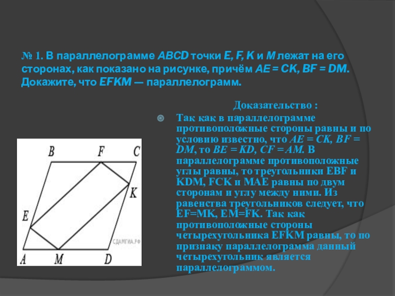 Так как в параллелограмме противоположные стороны равны и по условию известно, что АЕ = CK, BF = DM, то BЕ = KD, CF = AM. В параллелограмме противоположные углы равны, то треугольники EBF и KDM, FCK и MAE равны по двум сторонам и углу между ними. Из равенства треугольников следует, что EF=MK, EM=FK. Так как противоположные стороны четырехугольника EFKM равны, то по признаку параллелограмма данный четырехугольник является параллелограммом.