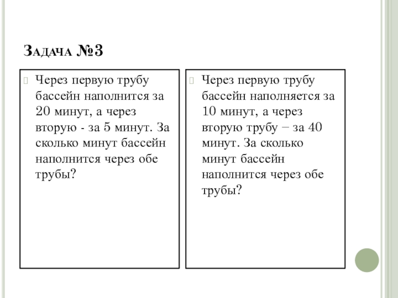 Через первую трубу бассейн наполняется за 10 минут, а через вторую трубу − за 40 минут. За сколько минут бассейн наполнится через обе трубы?