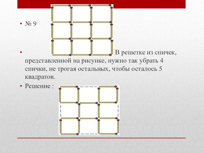 В решетке из спичек, представленной на рисунке, нужно так убрать 4 спички, не трогая остальных, чтобы осталось 5 квадратов.