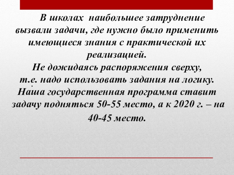 Наша государственная программа ставит задачу подняться 50-55 место, а к 2020 г. – на 40-45 место.