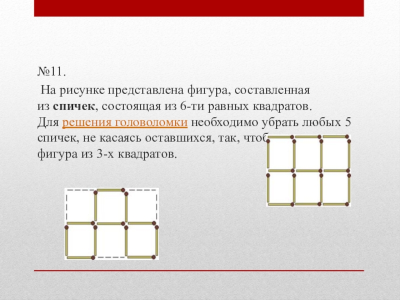 квадратов. Для решения головоломки необходимо убрать любых 5 спичек, не касаясь оставшихся, так, чтобы получилась фигура из 3-х квадратов.