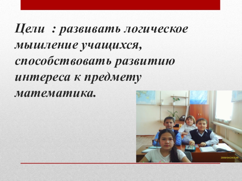 Цели : развивать логическое мышление учащихся, способствовать развитию интереса к предмету математика.