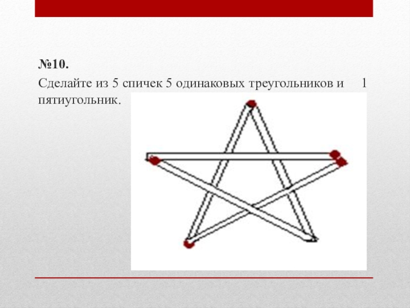 Сделайте из 5 спичек 5 одинаковых треугольников и 1