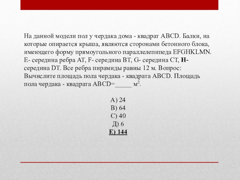 Слайд 24На данной модели пол у чердака дома - квадрат ABCD. Балки,