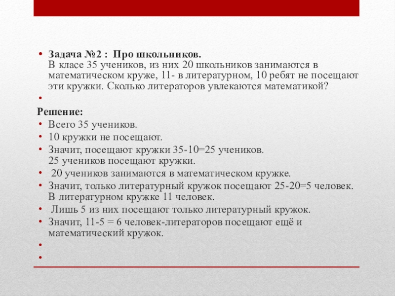 Значит, только литературный кружок посещают 25-20=5 человек.
