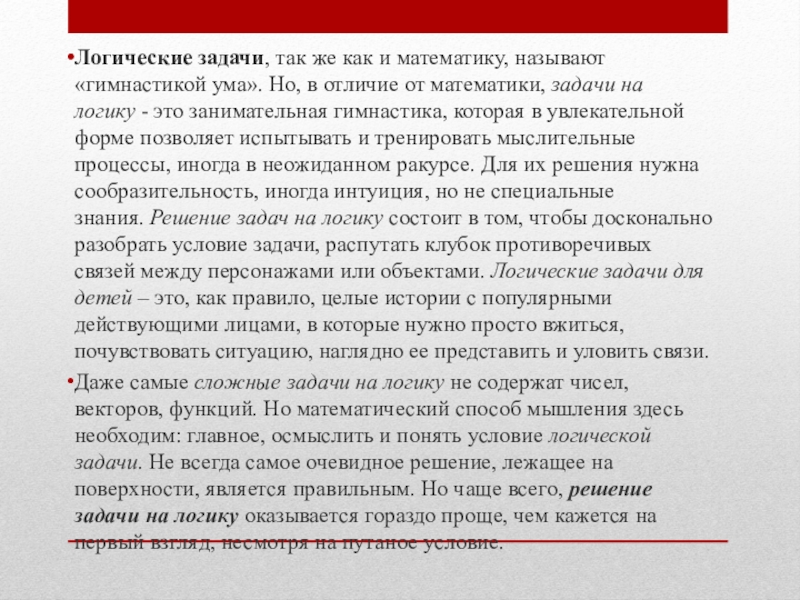 в отличие от математики, задачи на логику - это занимательная гимнастика, которая в увлекательной форме позволяет испытывать и тренировать мыслительные процессы, иногда в неожиданном ракурсе. Для их решения нужна сообразительность, иногда интуиция, но не специальные знания. Решение задач на логику состоит в том, чтобы досконально разобрать условие задачи, распутать клубок противоречивых связей между персонажами или объектами. Логические задачи для детей – это, как правило, целые истории с популярными действующими лицами, в которые нужно просто вжиться, почувствовать ситуацию, наглядно ее представить и уловить связи.