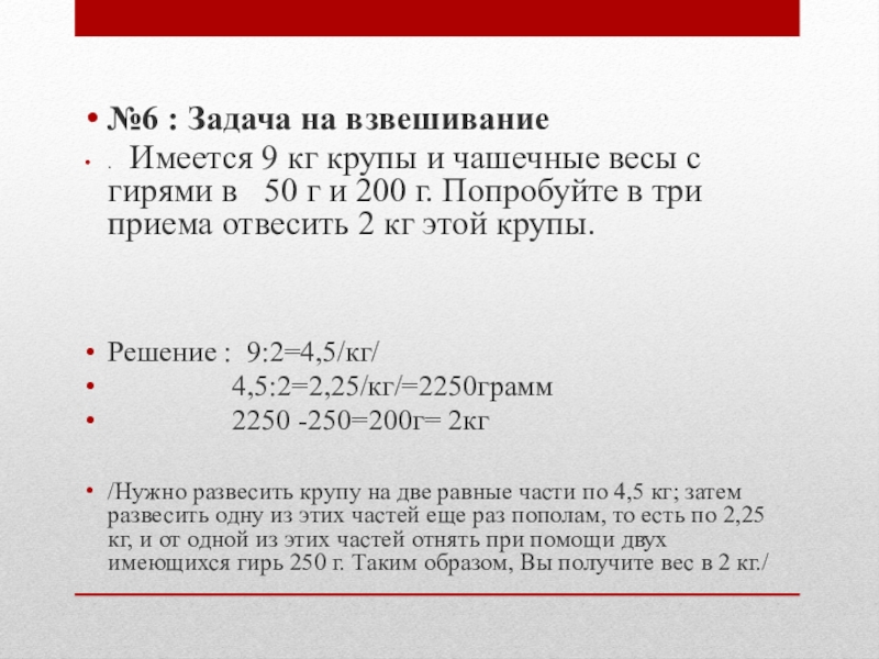 чашечные весы с гирями в 50 г и 200 г. Попробуйте в три приема отвесить 2 кг этой крупы.