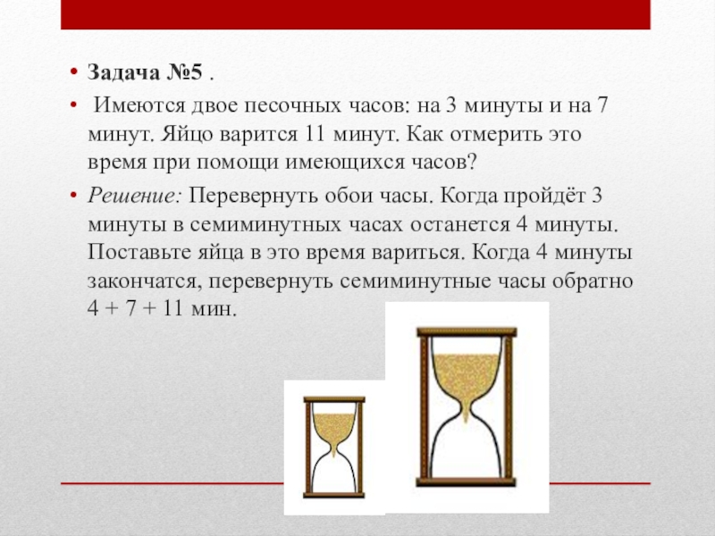 и на 7 минут. Яйцо варится 11 минут. Как отмерить это время при помощи имеющихся часов?