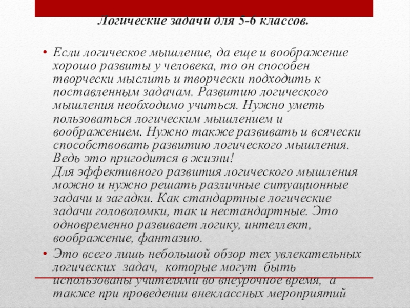 Это всего лишь небольшой обзор тех увлекательных логических задач, которые могут быть использованы учителями во внеурочное время, а также при проведении внеклассных мероприятий