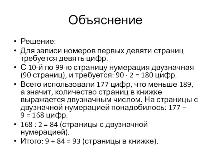 ОбъяснениеРешение:Для записи номеров первых девяти страниц требуется девять цифр.С 10-й по 99-ю страницу нумерация двузначная (90 страниц),
