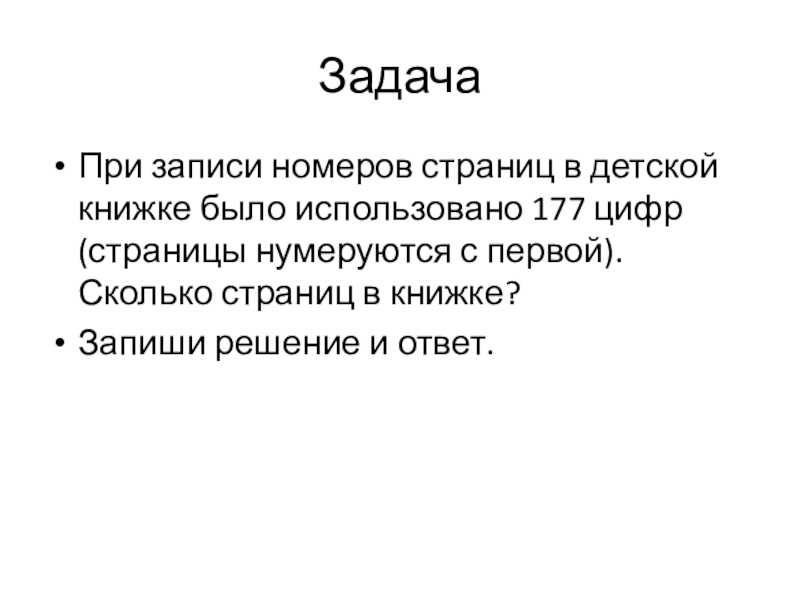 ЗадачаПри записи номеров страниц в детской книжке было использовано 177 цифр (страницы нумеруются с первой). Сколько страниц