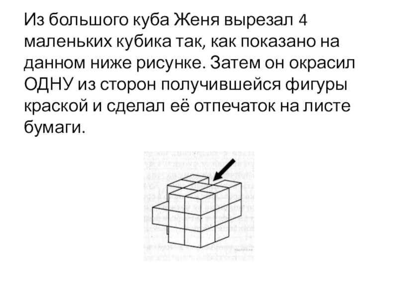 Слайд 10Из большого куба Женя вырезал 4 маленьких кубика так, как показано