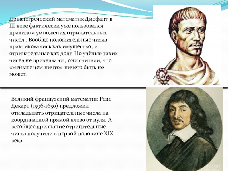Великий французский математик Рене Декарт (1596-1650) предложил откладывать отрицательные числа на координатной прямой влево от нуля. А всеобщее признание отрицательные числа получили в первой половине XIX века.