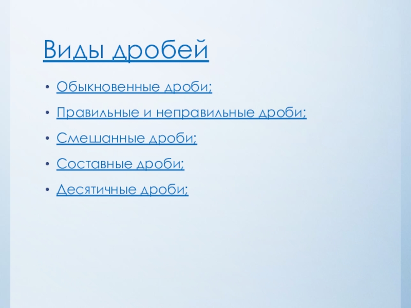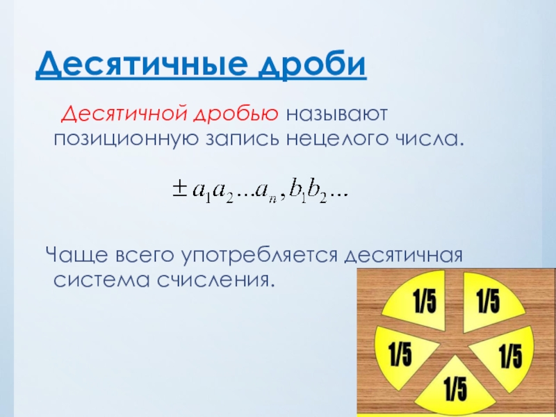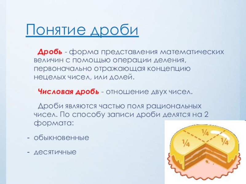 Дроби являются частью поля рациональных чисел. По способу записи дроби делятся на 2 формата: