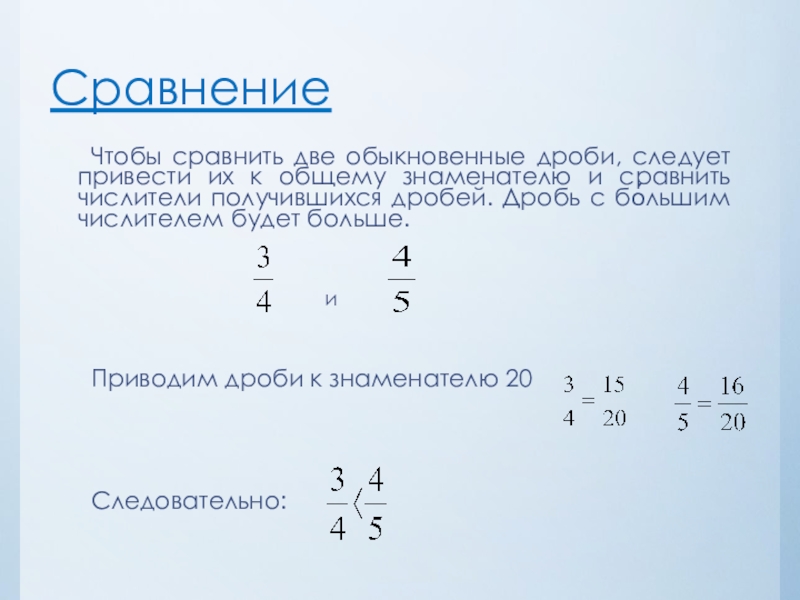 Чтобы сравнить две обыкновенные дроби, следует привести их к общему знаменателю