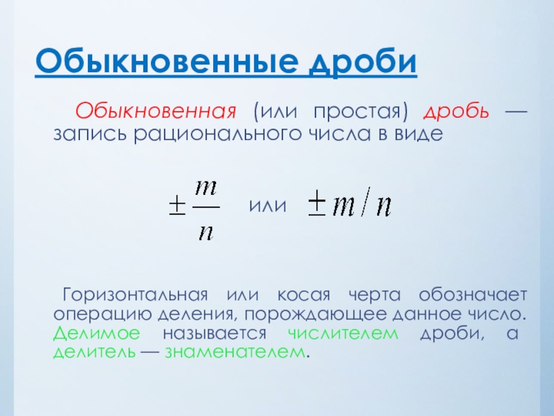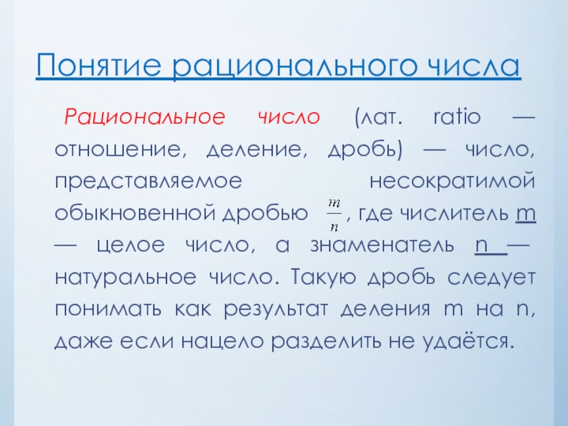 число, представляемое несократимой обыкновенной дробью , где числитель m — целое число, а знаменатель n — натуральное число. Такую дробь следует понимать как результат деления m на n, даже если нацело разделить не удаётся.