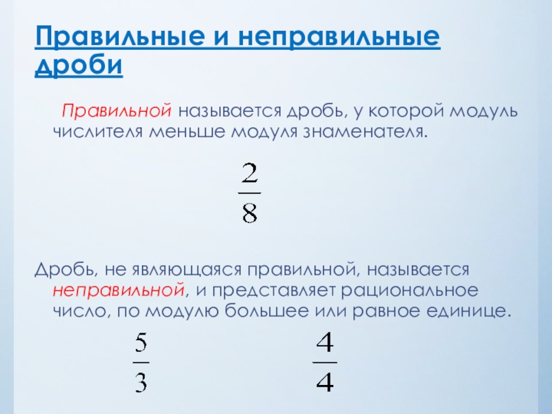 Дробь, не являющаяся правильной, называется неправильной, и представляет рациональное число, по модулю большее или равное единице.