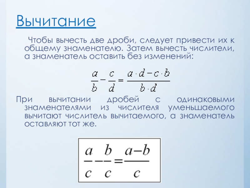 Чтобы вычесть две дроби, следует привести их к общему знаменателю. Затем