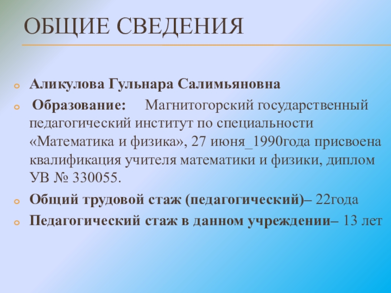 ОБЩИЕ СВЕДЕНИЯ Аликулова Гульнара Салимьяновна Образование:   Магнитогорский государственный педагогический институт по специальности «Математика и физика», 27