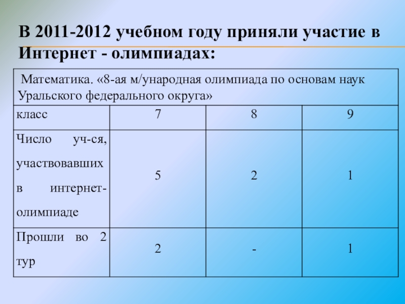 В 2011-2012 учебном году приняли участие в Интернет - олимпиадах: