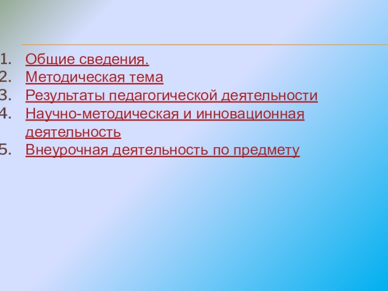 Общие сведения.Методическая темаРезультаты педагогической деятельностиНаучно-методическая и инновационная деятельностьВнеурочная деятельность по предмету